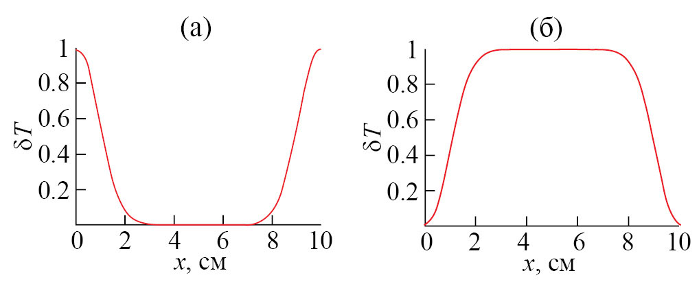 Рис. 9. Характерные случаи распределения температуры вдоль диаметра в поперечном сечении АЭ: а – сразу после нагрева в результате воздействия импульса накачки, б – после выравнивания температуры.