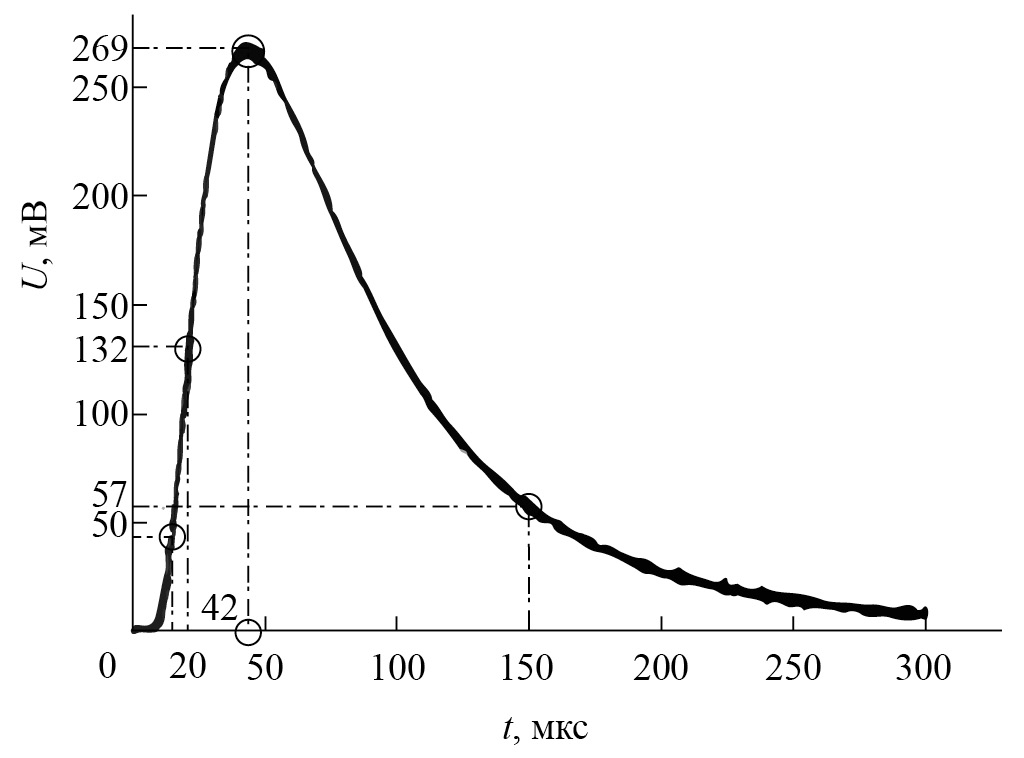 Рис. 1. Информативные признаки дифференциального вихретокового сигнала (светлые кружки) на зависимости амплитуды сигнала от времени (сплошная кривая).