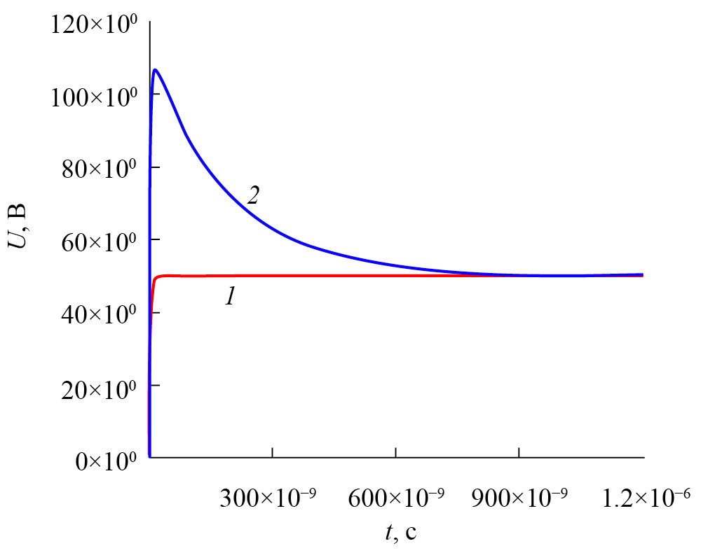 Следует отметить, что при проведении контроля композиционных объектов, состоящих из тонких слабопроводящих слоев, основной технической сложностью является необходимость снижения значения начальной глубины проникновения вихревых токов в объекте путем формирования прямоугольных импульсов тока с коротким фронтом в нагрузке, носящей индуктивный характер. Большинство современных сильноточных элементов коммутации, используемых в выходных каскадах импульсных вихретоковых генераторов, обеспечивают длительности процессов переключения порядка 20 нс. Однако ввиду того, что нагрузка генератора носит индуктивный характер, время нарастания тока возбуждения в ней больше, чем время нарастания приложенного напряжения. При длительности переднего фронта напряжения возбуждения, равной 20 нс, длительность возбуждающего тока в датчике (со значением индуктивности около 10 мкГн и сопротивлением порядка 10 Ом) составляет не менее 1.3 мкс, что недопустимо при контроле тонкослойных объектов.