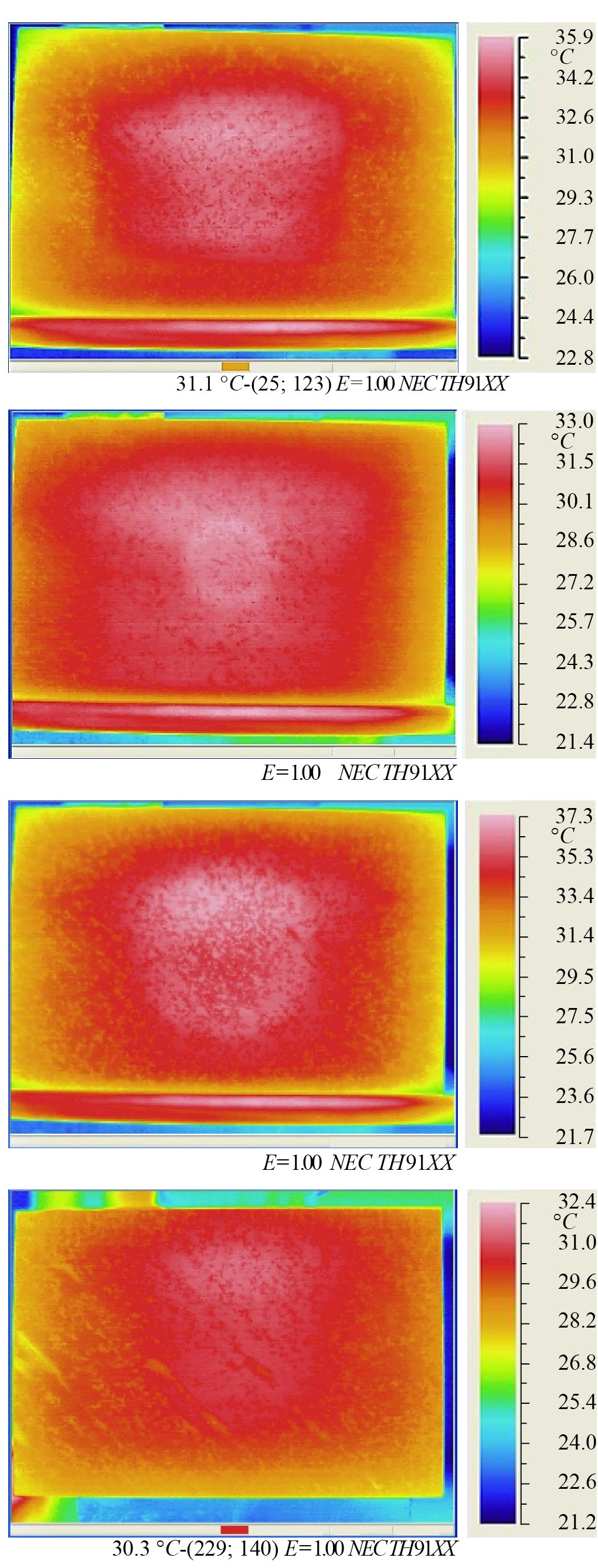 Был выбран длительный нагрев одним импульсом как оптимальный для получения контрастных термограмм данных объектов, представляющих собой образцы из слоев с высокой теплопроводностью, что было получено на предварительной фазе исследования. При этом рассматривались наиболее распространенные режимы нагрева [12]. Нагрев образцов осуществлялся галогенной лампой мощностью 500 Вт. Расстояние от объекта исследования до источника нагрева составляло 30 мм. Длительность нагружения образцов варьировалось в диапазоне от 1 до 5 с и контролировалась электронным таймером TDM SQ1506-0002, подающим напряжение на лампу. Для регистрации термограмм применялся тепловизор NEC TH9100 PWV с температурным разрешением 0.02 °С. Его удаление от объекта составляло 500 мм. Для анализа и регистрации термограмм использовалось программное обеспечение NEC Image processor 4.7. В ходе испытаний была обнаружена существенная зависимость температурного контраста в зоне искусственного дефекта от длительности тестирующего нагрева Δt. При ее оптимальном значении Δtопт регистрируемые термограммы позволяли уверенно обнаруживать подповерхностные дефекты структуры (рис. 8). Экспериментально было получено, что для имеющихся образцов с глубинами залегания расслоений в диапазоне 0.678 … 1.356 мм оптимальное время нагрева в зависимости от глубины залегания составляло 2.5 … 3.5 с.