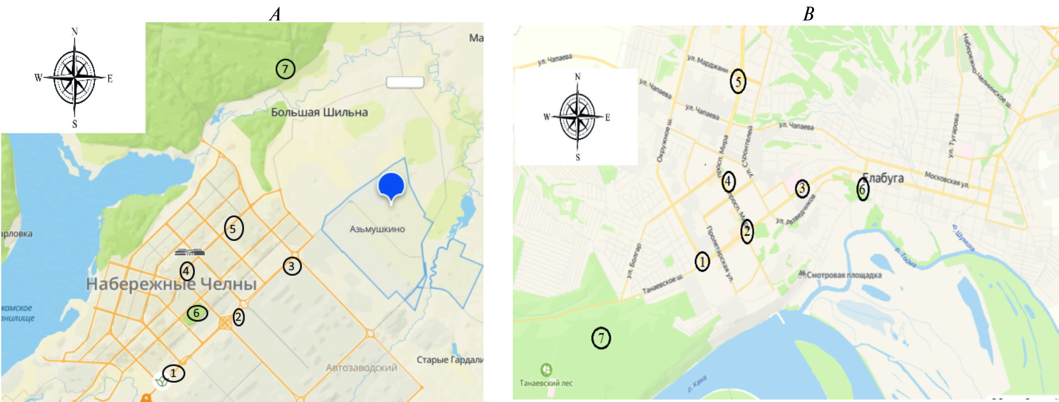 A – г. Набережные Челны: 1, 2, 3 – ул. Машиностроителей, 4, 5 – пр. Мира, 6 – Парк Гренада (контрольная зона), 7 – Челнинское участковое лесничество (контрольная зона). B – г. Елабуга: 1, 2, 3 – пр. Нефтяников, 4, 5 – пр. Мира, 6 – Александровский сад (контрольная зона), 7 – Танаевский лес (контрольная зона).