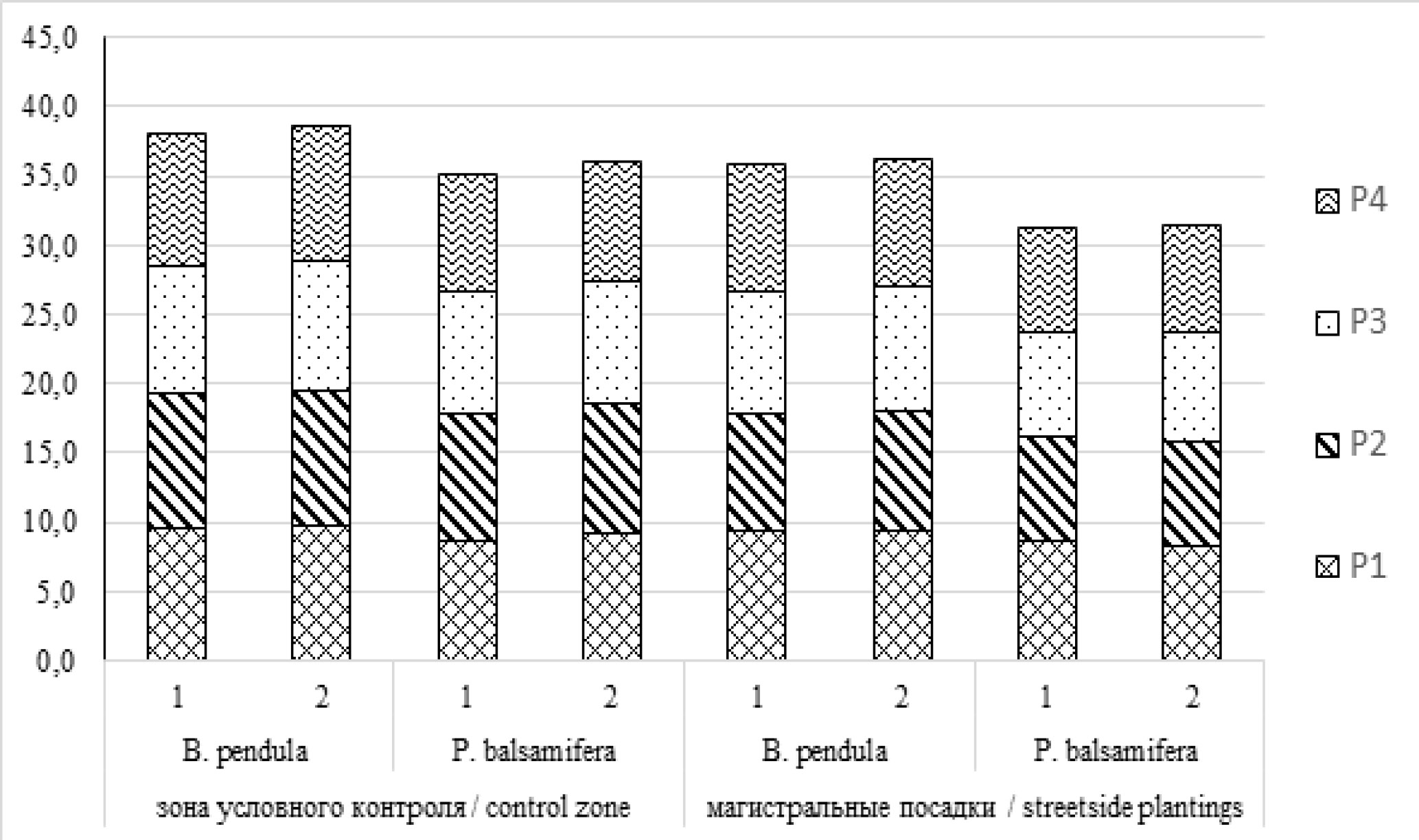 B. pendula является аборигенным видом, который широко распространен на территории Республики Татарстан (встречается как в естественных, так и искусственных насаждениях). P. balsamifera – интродуцированный вид, широко представлен в городских насаждениях.