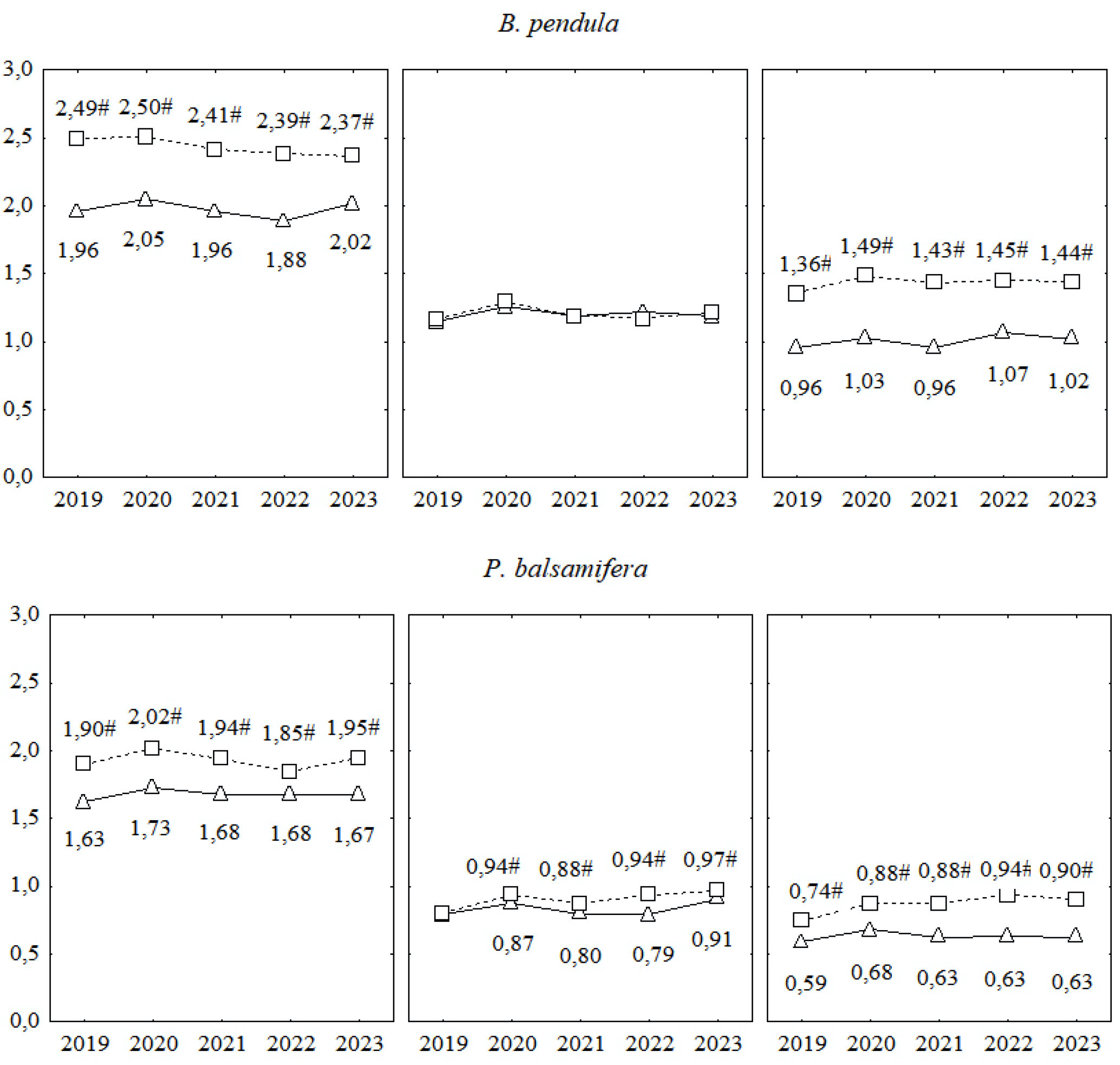 Note: # – statistically significant differences compared to the control (р < 0.05); -∆- – control zone; -□- – streetside plantings.