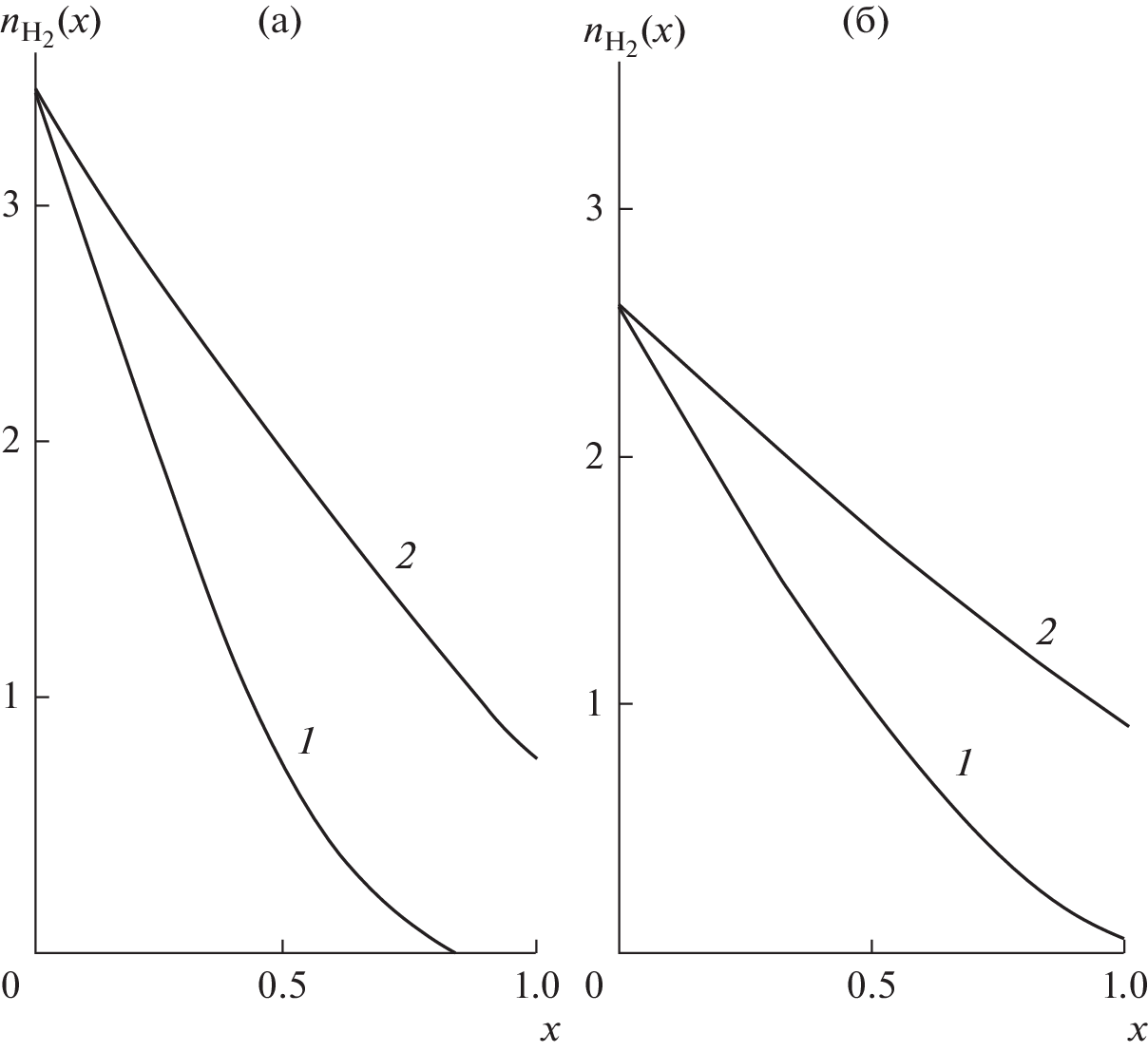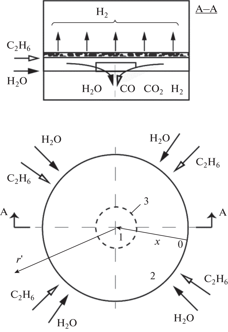 A model of steam reforming of pure ethane in a membrane catalytic reactor is proposed. The working elements of the reactor are cylindrical chambers, between which a hydrogen-selective palladium foil is placed. The upper chamber is vacuumized, and the lower one contains a nickel catalyst. In the case of uniform feed of the feedstock (С2Н6 and Н2О) along the perimeter of the lower chamber, the problem is reduced to finding the average flows of С2Н6, СН4, Н2О, СО, СО2, and Н2 by solving a system of nonlinear ordinary differential equations. The studies are carried out in the temperature range of 700–1000 K at acceptable steam/ethane input flow ratios of more than four. The optimal conditions for the process, at which the hydrogen yield is 100%, are found. It is proved that under these conditions and a fixed temperature, the maximum hydrogen flow through the membrane is observed at the minimum permissible ratio of the steam and ethane input flows, equal to four. Comparison of the calculations with the experimental data confirm the assumption of the existence of two sections in the lower chamber (short initial and main sections).
