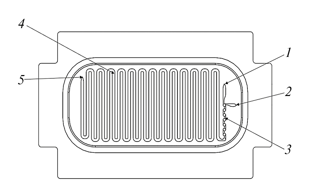 Рис. 1. Эскиз выбранной геометрии проточной части (1, 2 – входы реагентов, 3 – миксерная зона, 4 – реакционный канал, 5 – выход продукта).