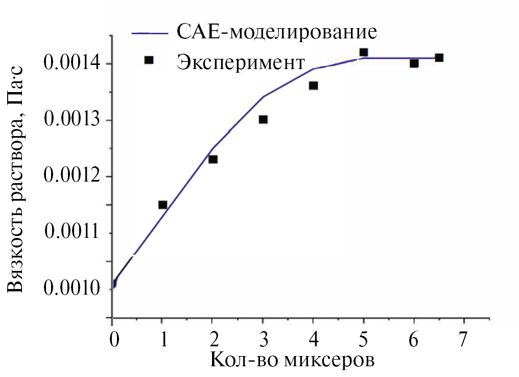 Использовали магнитную мешалку с минимальным количеством оборотов, что эквивалентно эффективности перемешивания в смесительной ячейке. Проводили гомогенизацию двухфазной системы “ацетон–вода” в щелочной среде. В программе вычислительного моделирования определяли время пребывания реакционной среды в различном количестве ячеек. Время перемешивания в магнитной мешалке варьировали эквивалентно расчетным данным. Далее определяли вязкость смеси на капиллярном вискозиметре ВПЖ-2. По достижении необходимой вязкости перемешивание считали законченным.