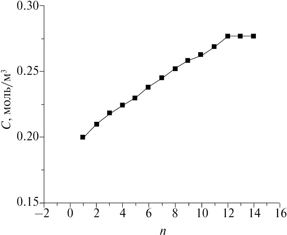 Используя вышеперечисленные входные данные, была получена зависимость количества итераций длин канала от концентрации получаемого продукта. Наиболее оптимальной длиной канала является 14-я итерация, с суммарной длиной канала 1624 мм, поскольку дальнейшее изменение концентрации получаемого продукта стремится к нулевому значению (рис. 6). Гидродинамические параметры проточной части такой модели следующие: