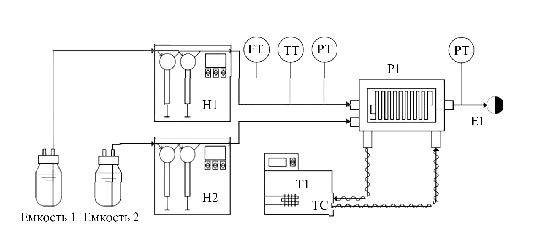 За 10 минут до предполагаемого начала реакции на контроллере устанавливают температуру реакции (130–200 °C, в зависимости от условий процесса) и включают термостатирование. После достижения заданной температуры в реактор реагент 1 и регент 2 поступают с помощью дозирующих шприцевых насосов Н1 и Н2 соответственно в реактор Р1, обогреваемый термостатом T1 под давлением 40 бар. В данном узле происходит химическая реакция, реагент собирается в емкости для конечного продукта E1. Подачу (1 минута) осуществляют насосом высокого давления. Пробы отбирают в течение 1,5 часа, объем проб 0,15–0,2 мл. Пробы отбирают, варьируя расходы реагентов на входе, итоговая проба отвечает времени пребывании реакционной смеси в канале.