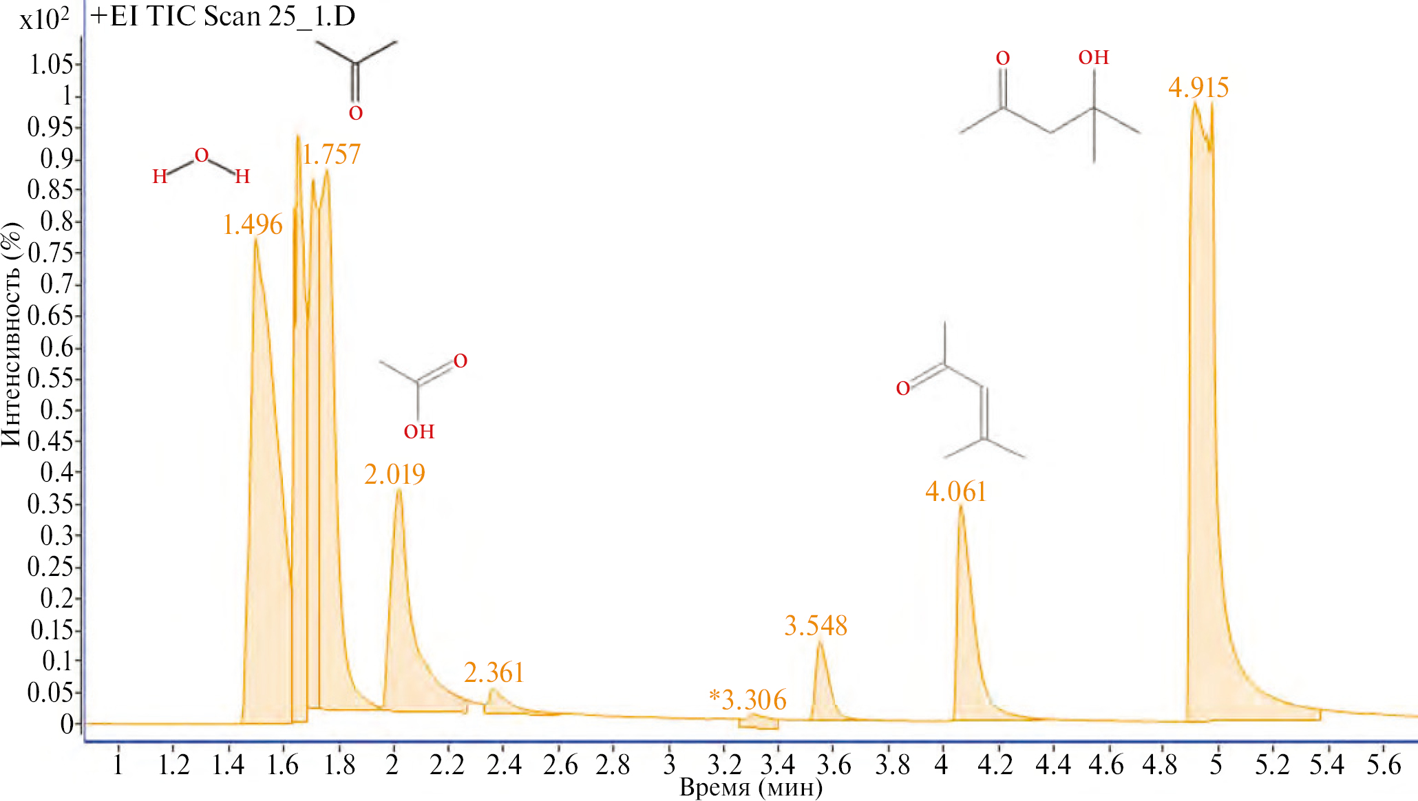 Рис. 10. Общая хроматограмма образца на начальный отрезок времени.