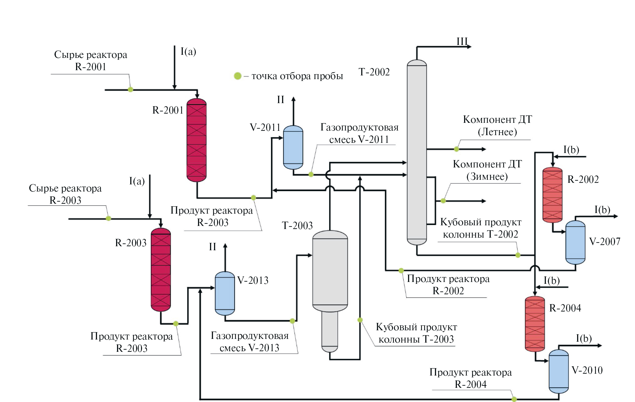 Рис. 1. Технологическая схема двухлинейного двухступенчатого гидрокрекинга с точками отбора образцов для лабораторных исследований: R-2001, R-2003 – реакторы гидрокрекинга первой ступени, V-2011, V-2013 – горячие сепараторы низкого давления, T-2002 – колонна фракционирования продуктов реакторов, T-2003 – отпарная колонна продуктов реакторов второй линии, R-2002, R-2004 – реакторы гидрокрекинга второй ступени, V-2007, V-2010 – горячие сепараторы высокого давления; I – циркуляционный ВСГ первой (a) и второй (b) ступеней, II – ВСГ низкого давления, III – углеводородные газы и нестабильный бензин.