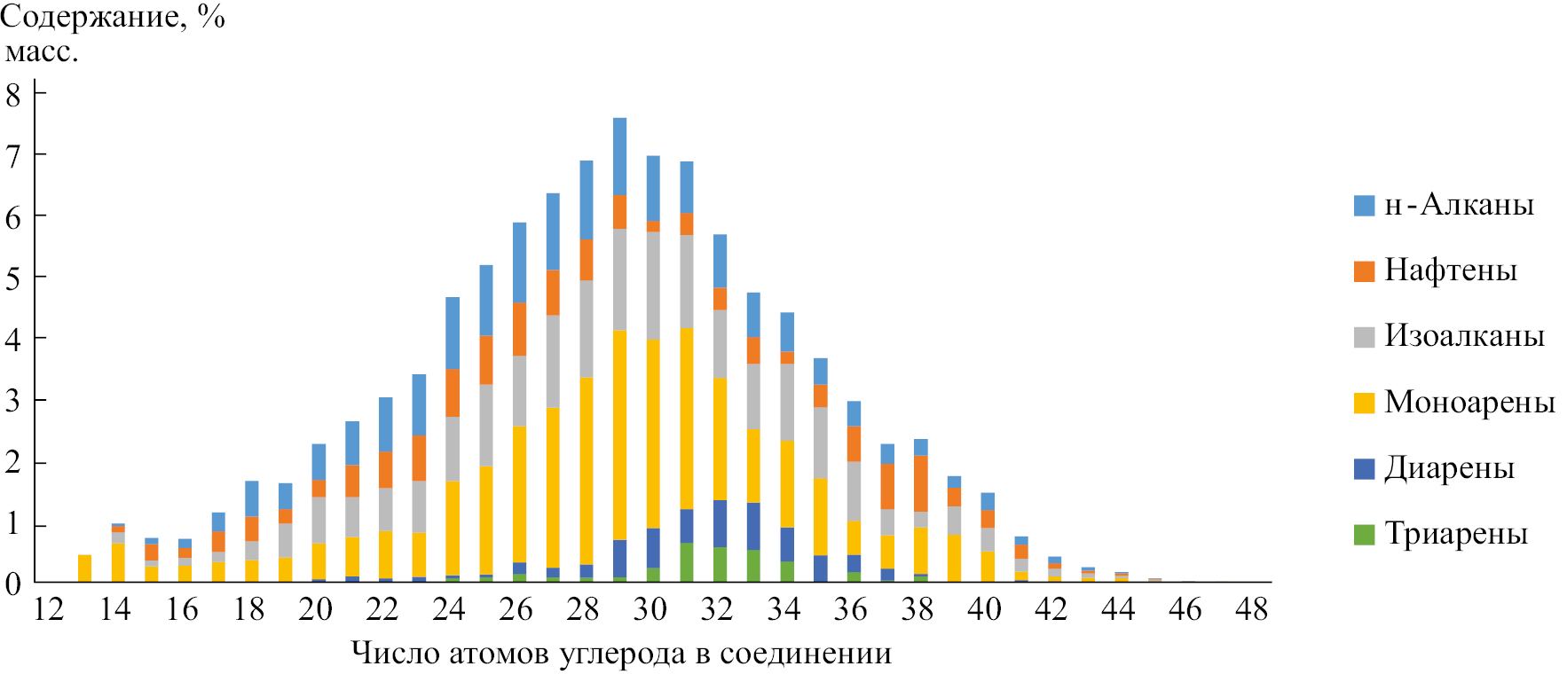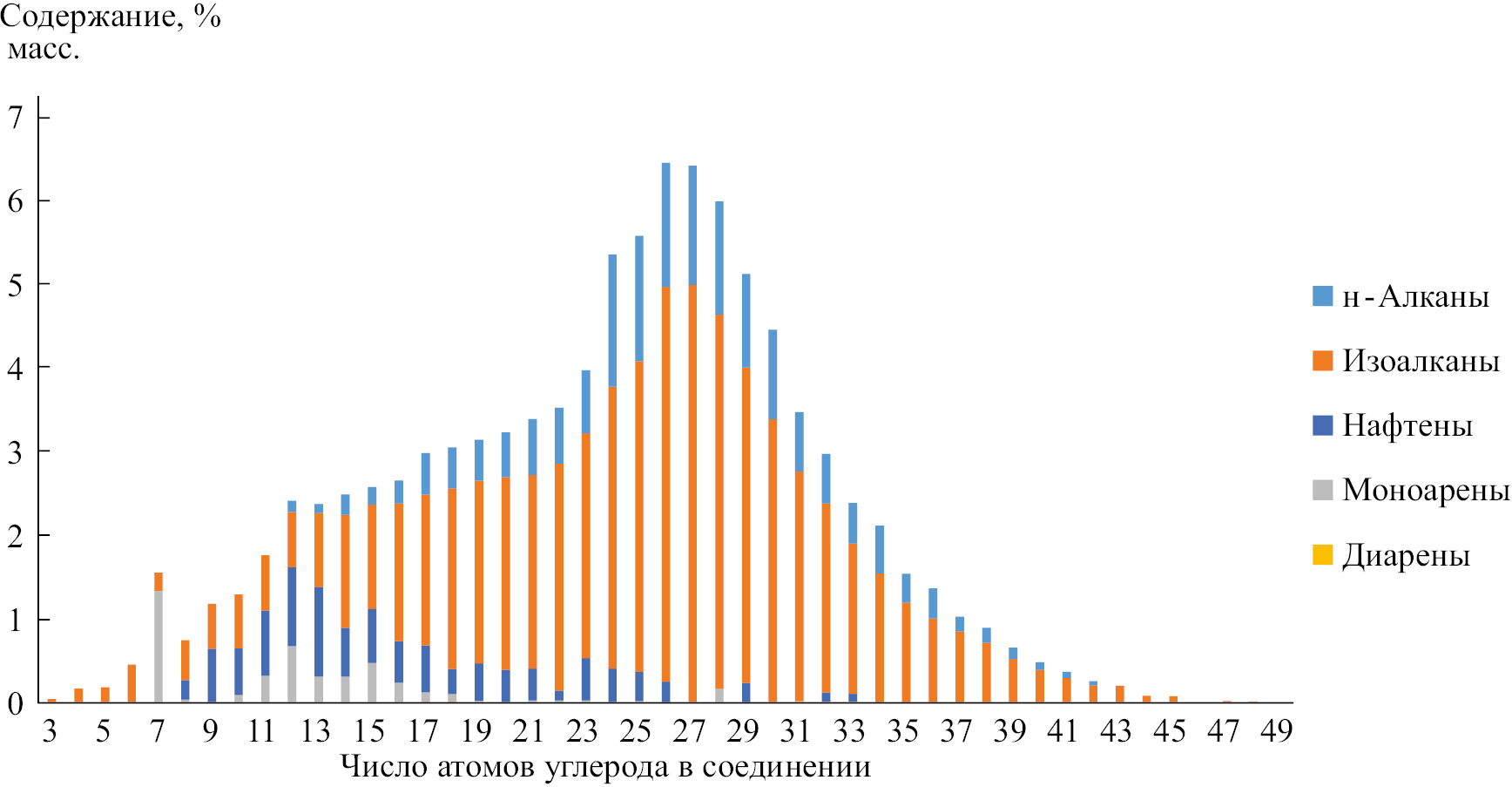Рис. 6. Распределение групп углеводородов в кубовом продукте колонны фракционирования по числу атомов углерода в молекуле.