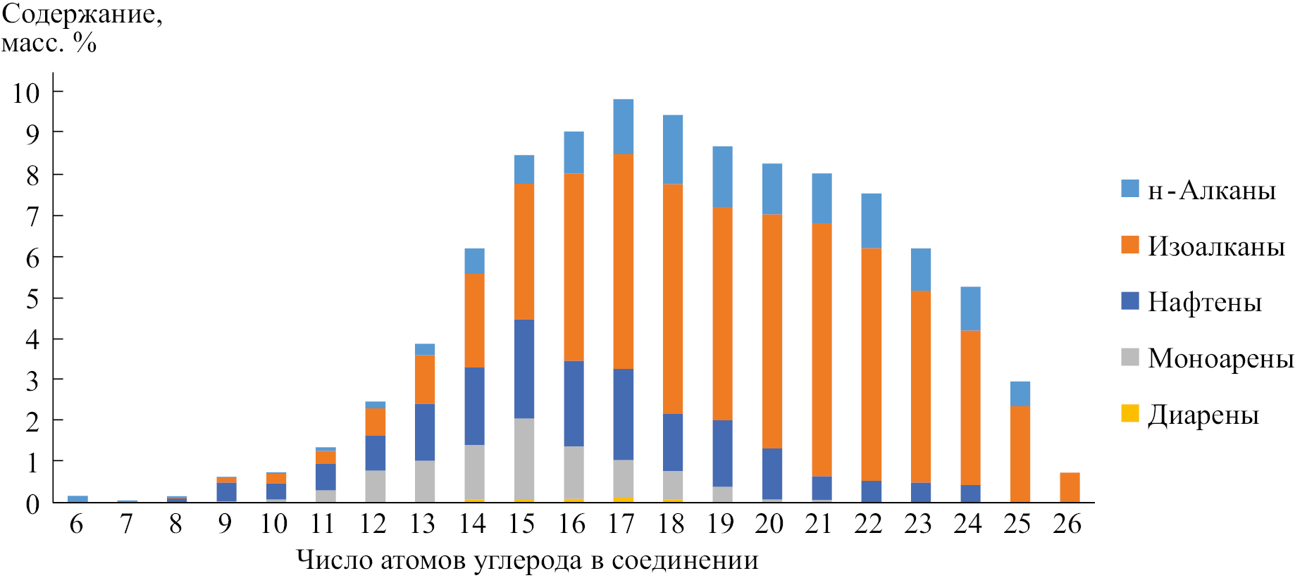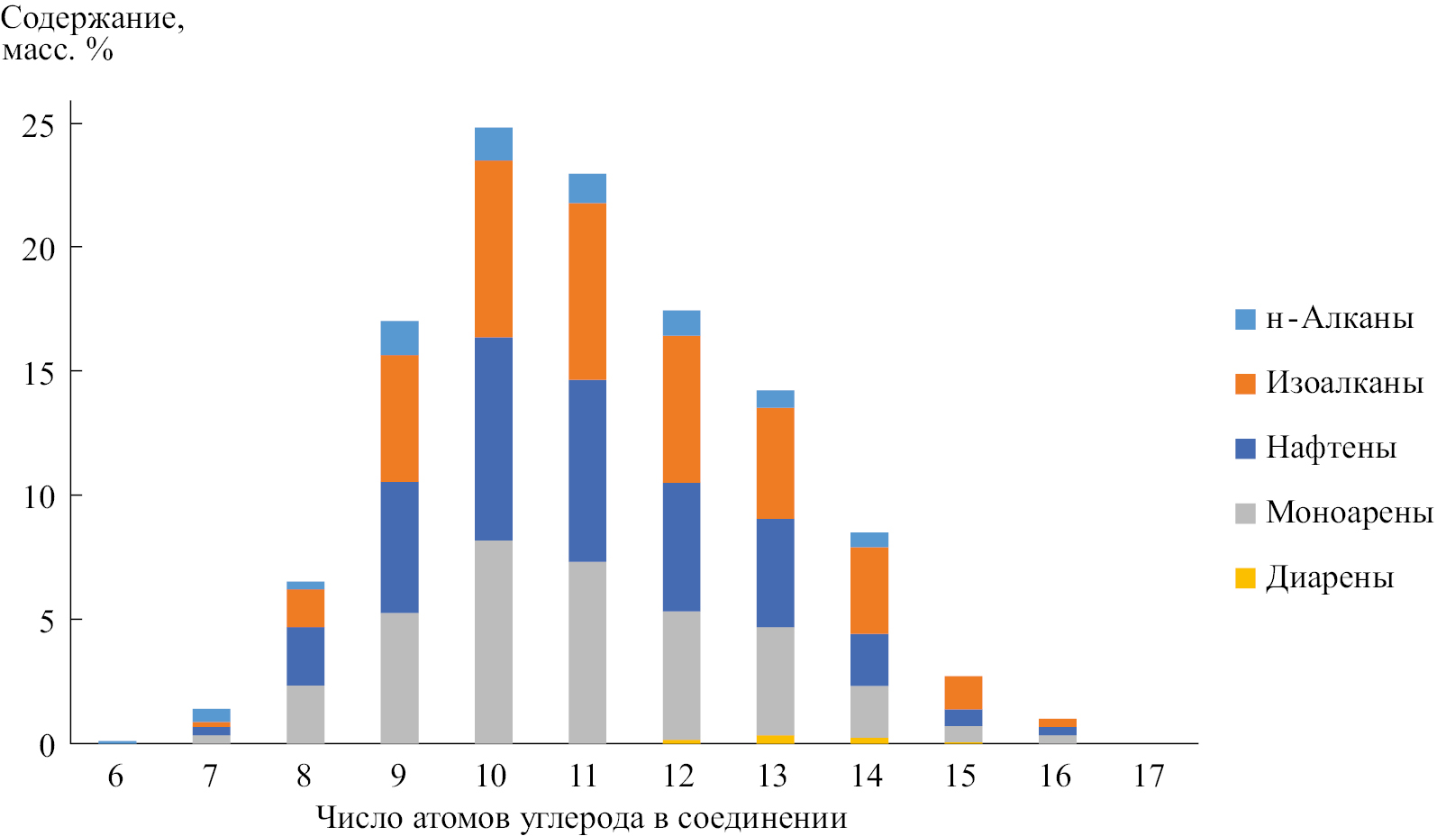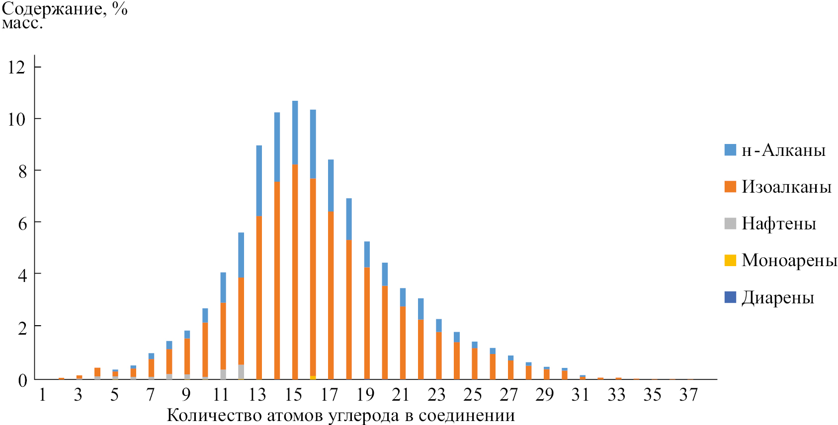 Рис. 8. Распределение групп углеводородов в образце компонента зимнего дизельного топлива по числу атомов углерода в молекуле.