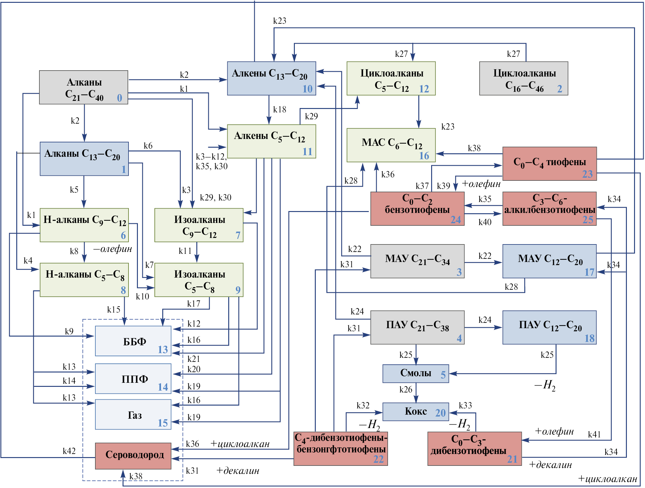 На рис. 11 приведена реакционная схема процесса каталитического крекинга, базирующаяся на результатах жидкостно-адсорбционной и газовой хроматографии, в общем виде представлена набором 43 реакций с участием 26 компонентов.