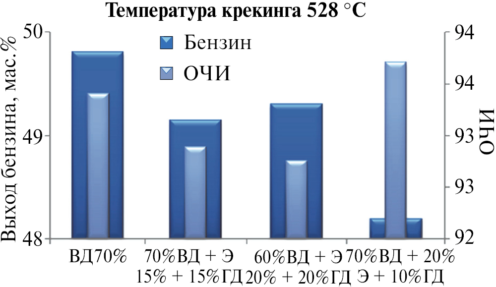 Прогнозные расчеты показали, что при вовлечении в переработку вакуумного газойля 10% высокоароматизированного компонента – экстракта селективной очистки масел, выход бензина снижается на 1,8% масс. с увеличением его октанового числа на 0,8 п., выход и содержание кокса возрастает на 0,56 и 0,11% масс. Снижение октанового числа бензина, вызванное вовлечением высокопарафинового компонента в переработку вакуумного газойля, составило 1,5 пункта при увеличении выхода бензина на 2,44% масс., при этом выход легких олефинов значительно возрос на 3% (153 т/сут). Установлено, что вовлечение в переработку смесевого сырья, содержащего 15% гача дистиллятного и 15% экстракта селективной очистки масел, позволяет увеличить производительность установки каталитического крекинга с 56,2 до 80,3% и является благоприятным при организации топливного режима.