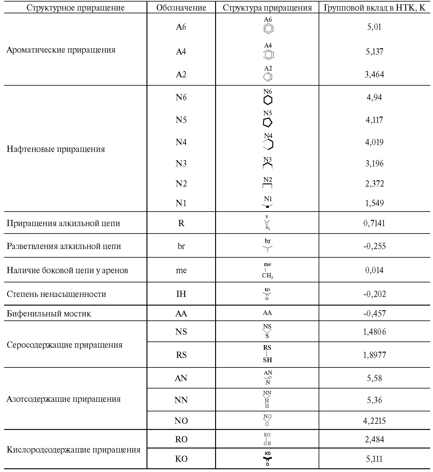 Использование метода SOL в совокупности с методом группового вклада позволило представить углеводороды вакуумного газойля с помощью векторов структурных приращений. Данные структурные приращения приведены в табл. 6, на их основе были рассчитаны нормальные температуры кипения углеводородов.