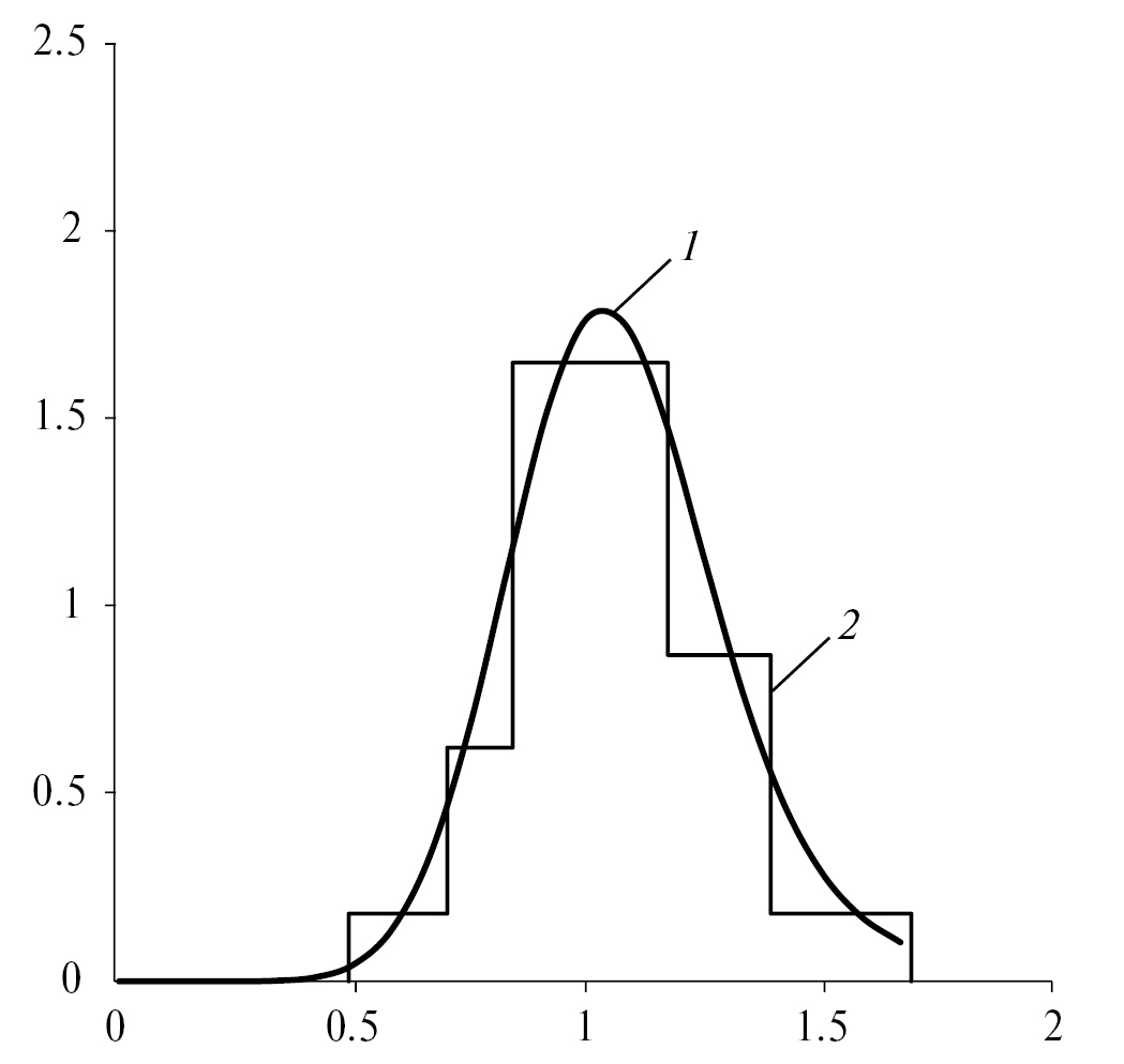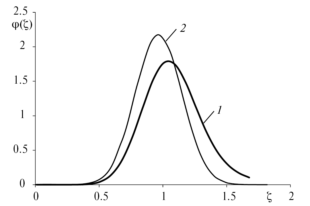 На рис. 1 представлены расчетные кривые, полученные по формулам (27) и (28), для внешнего рецикла и продукта на выходе из аппарата при значении b = 0.11. Анализ кривой плотности распределения гранул по приведенному радиусу , рассчитанной по формуле (28), и экспериментальных результатов на гистограмме, представленных на рис. 2, показал удовлетворительную сходимость результатов, отклонение составляет не более 12%.