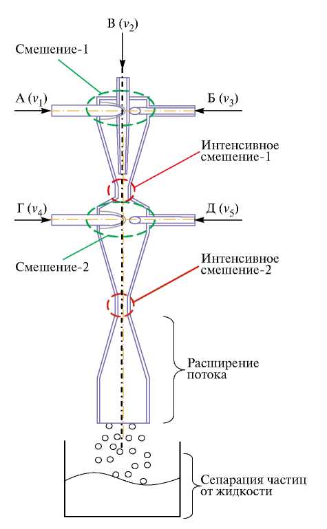 На рис. 3 представлены зоны умеренного (смешение-1, смешение-2 в широких частях аппарата) и интенсивного смешения (в горловинах), расширения и сепарации частиц в двухступенчатом микрореакторе. Первая стадия интенсивного смешения осуществляется в верхней горловине аппарата, вторая – в нижней горловине. Это позволяет проводить синтез в две стадии, каждая из них протекает в соответствующей ступени (секции) аппарата.