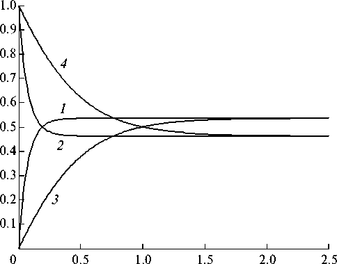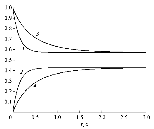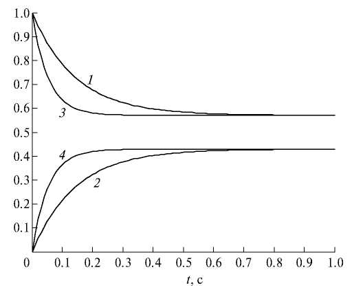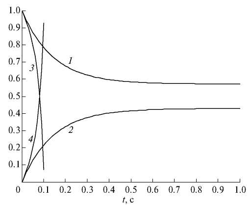 Рис. 3. Динамика концентраций интермедиатов реакции (1) с кинетикой ЗДМ при α = 0 и МДД (x*, z*) при γ = 1.4286 > 0: 1 – z; 2 – x; 3 – z*; 4 – x*.