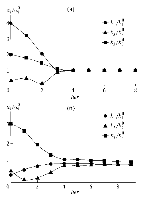 Результаты численных экспериментов показали, что предложенный метод устойчив относительно погрешностей исходной информации. На рис. 5 приводится сходимость итерационного процесса при возмущенных исходных данных, где– истинные значения оцениваемых параметров.