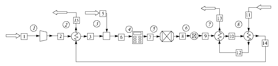 Элементы представлены номерами в кружочках, потоки – номерами в квадратах. Потоки на входе и выходе: 1 – воздух; 5 – мазут; 11 – сырая нефть; 13 – подогретая нефть в колонну; 15 – дымовые газы в атмосферу. Элементы: 1 – компрессор; 2 – рекуператор; 3 – смеситель; 4 – модуль-калькулятор для расчета сгорания мазута; 5 – реактор Гиббса; 6 – модуль для расчета температуры; 7 – камера радиации печи; 8 – камера конвекции печи.