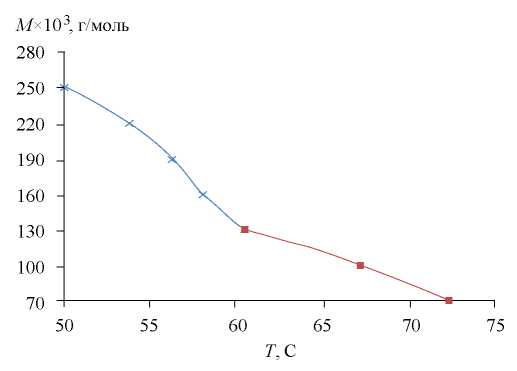 Рис. 5. Зависимость средневесовой молекулярной массы полимера от температуры.