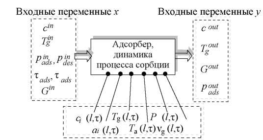 Циклический процесс адсорбционного разделения многокомпонентных газовых смесей по способу КЦА заключается в последовательной организации стадий адсорбции и десорбции с разными характеристиками потоков на входе и выходе из адсорберов. Перечень входных и выходных переменных процесса сорбции компонентов газовой смеси в адсорбере установки КЦА как объекта математического моделирования отражает структурная схема на рис. 2.