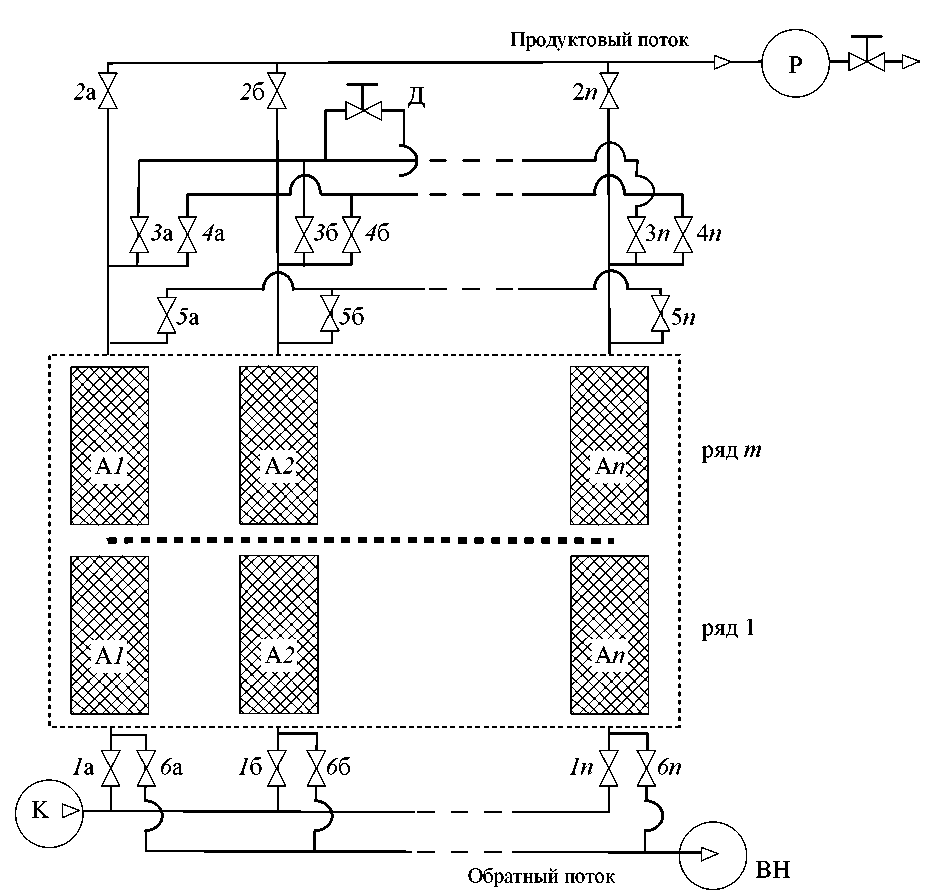 В общем случае установка КЦА может включать несколько рядов адсорберов, в каждом из которых может располагаться от двух и более аппаратов. Верхний и нижний ряды адсорберов соединяются с трубопроводами подачи исходной газовой смеси 1, продуктовой смеси 2, поступающей в ресивер P, дросселирования 3, 4, выравнивания давлений 5, обратного потока 6, а также в зависимости от реализуемой схемы – с компрессором (K) и/или вакуум-насосом (BH). Соединения между рядами адсорберов могут включать линии прямотока, перекрестного тока между аппаратами, рециклы и байпасы.