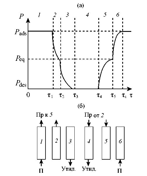 Рис. 4. Циклограмма работы и схема потоков для одного адсорбера установки КЦА в течение цикла. (а) – циклограмма работы для одного адсорбера установки КЦА в течение цикла; (б) – схема потоков для одного адсорбера установки КЦА в течение цикла. Стадии цикла: 1 – адсорбция, 2 – сброс давления, 3 – понижение давления, 4 – противоточная промывка, 5 – подъем давления, 6 – повышение давления питающим потоком, П – питающий поток, Пр – продуктовый поток, Утил. – поток на утилизацию.
