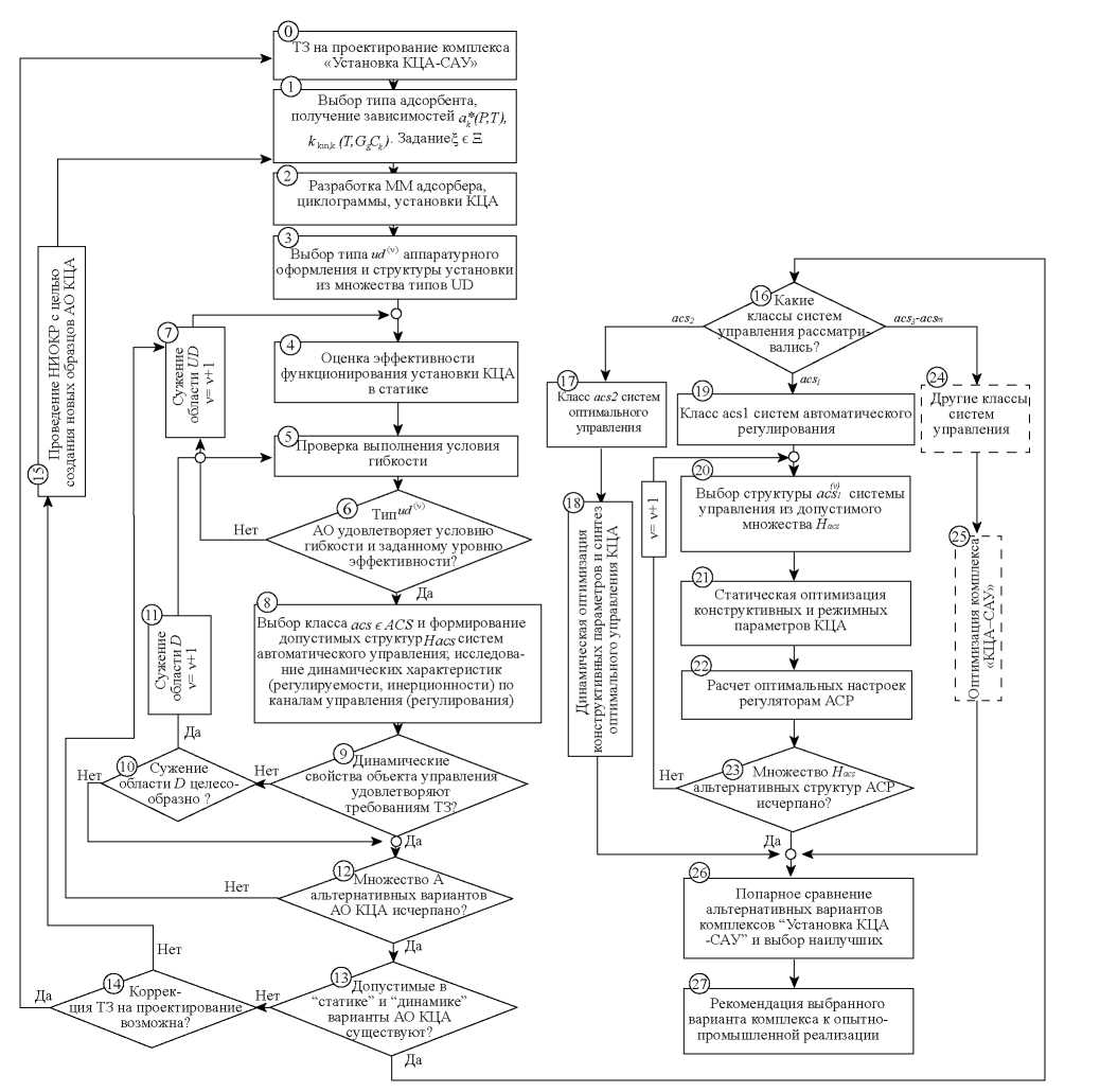 На заключительном этапе интегрированного проектирования (блоки 26, 27) осуществляется решение задачи оптимизации для альтернативных комплексов “Установка КЦА-САУ” по критерию экономической эффективности производства продуктового газа (водорода). В ходе имитационных исследований помимо вычисления оценок показателей экономической целесообразности, энерго- и ресурсосбережения, также определяется техническое задание на точность и быстродействие информационно-измерительной подсистемы, алгоритмов оптимального управления, исполнительных механизмов и устройств управления, на разработку подсистем адаптации моделей и алгоритмов управления. По результатам имитационных исследований проверяется достижимость поставленных целей функционирования установки КЦА и осуществимость требований ТЗ на проектирование. В том случае, если эти требования не достижимы (блоки 6–14), осуществляется переход к новым вариантам аппаратурно-технологического оформления циклического процесса КЦА или выбору новой структуры технологической схемы установки КЦА.
