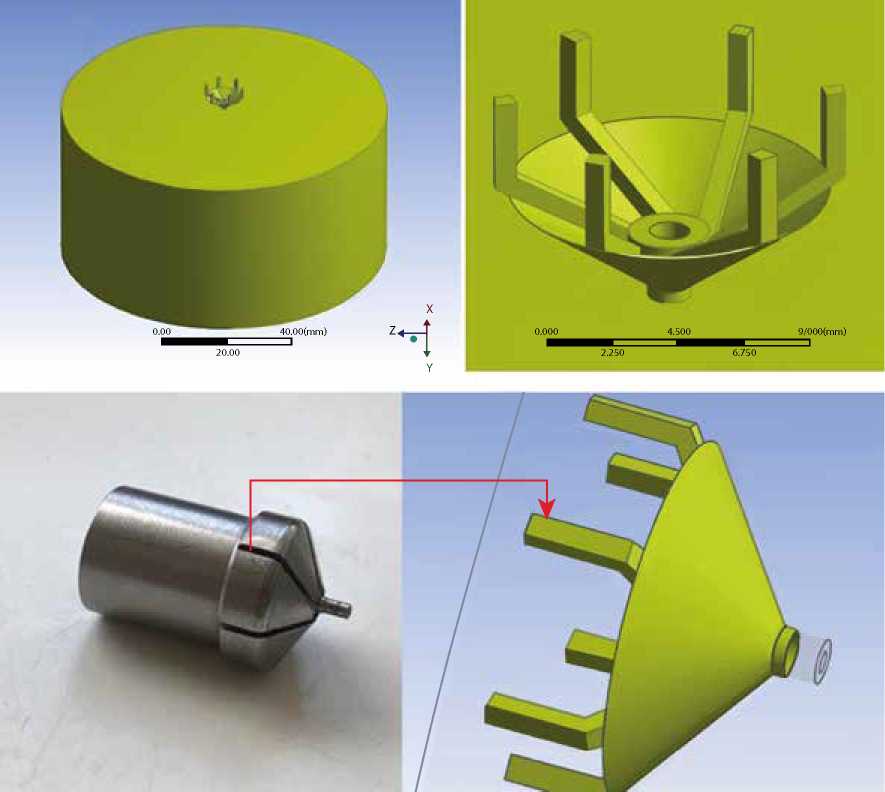 Электронная модель конструкции внутреннего объема сопла пневматической форсунки и части сушильной камеры была реализована с использованием ANSYS Design Modeler. Полученная электронная модель была использована для описания гидродинамики потоков распыляющего воздуха внутри форсунки и вблизи выходного отверстия (рис. 4).