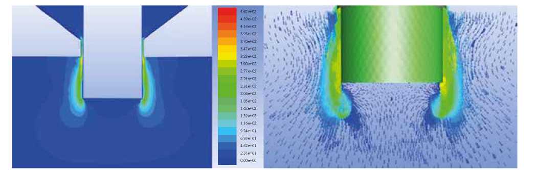 Рис. 6. Профиль скоростей (слева) и поле векторов скоростей (справа) распыляющего воздуха.