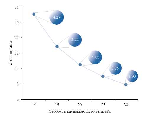 На рис. 10 представлена зависимость размера капли от скорости распыляющего воздуха, а также приведены размеры частиц, соответствующие диаметру капли.