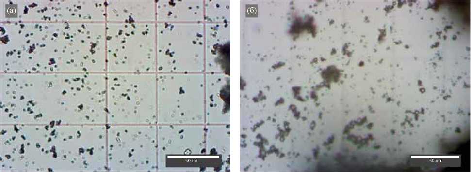 Аналитическое исследование частиц. С помощью оптического микроскопа Micros MCX-100 Crocus и камеры Горяева проводилось исследование размеров и дисперсных характеристик полученных частиц. Дисперсионный анализ частиц был выполнен на основе обработки фотографий (рис. 11), сделанных с помощью оптического микроскопа [33]. Для обработки снимков использовалась программа Image J.