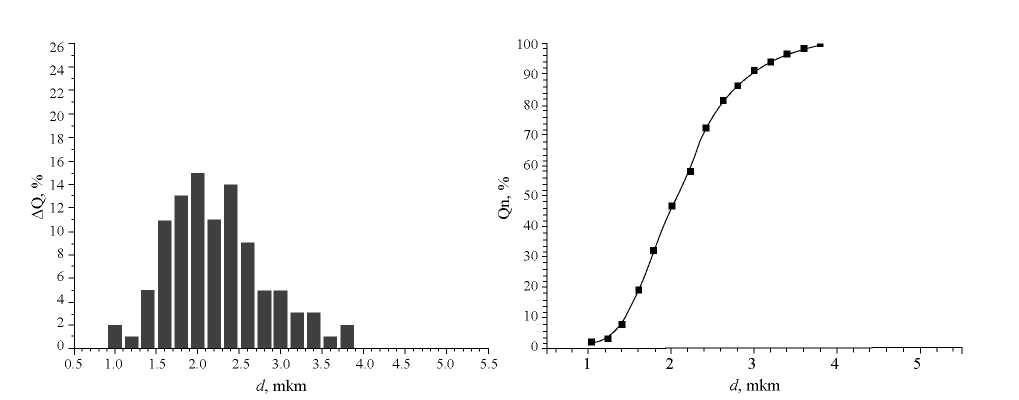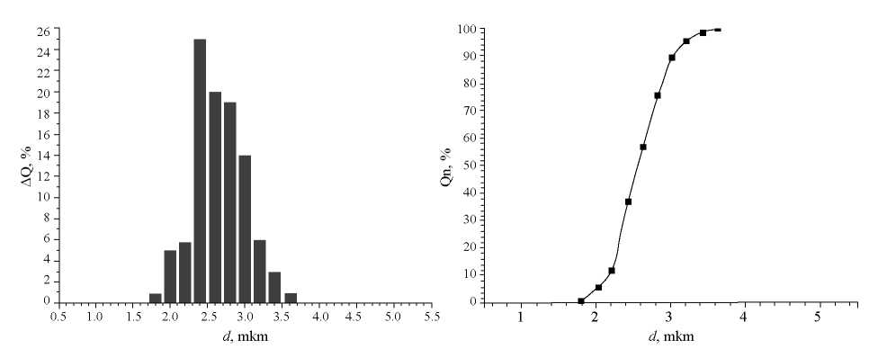 Проведенные эксперименты при рассчитанных оптимальных параметрах позволили получить микрочастицы, имеющие средние размеры частиц 2.6 мкм и распределение от 1 до 4 мкм.