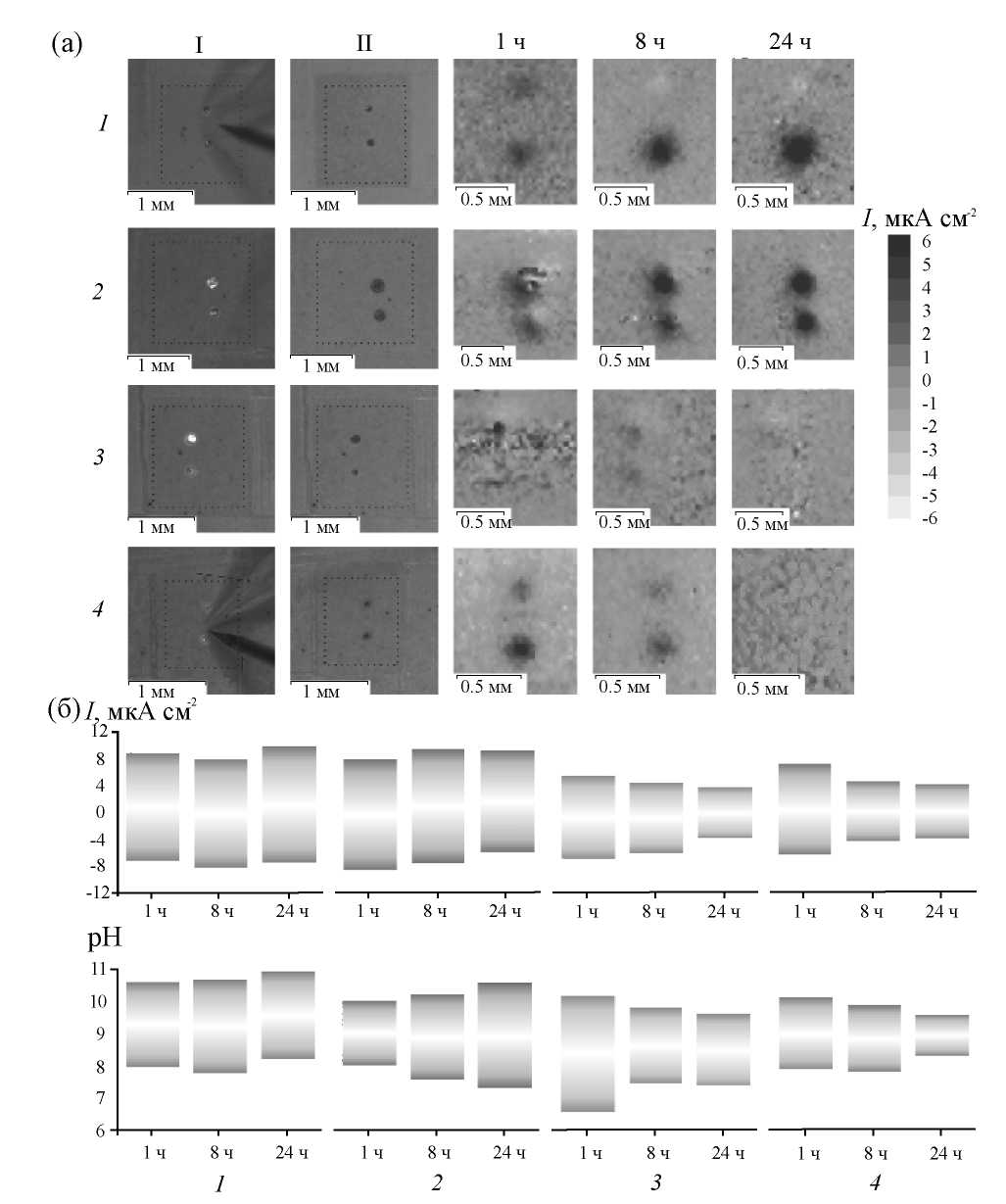 Рис. 7. Распределение локальной плотности тока (SVET-карты) для образцов с искусственно созданными дефектами на поверхности защитных покрытий, полученное при разном времени выдержки образцов в 0,05 М растворе NaCl, и оптические изображения сканированных участков (до выдержки – I, после 24 ч выдержки – II) (а). Изменение локального pH и локальной плотности тока для образцов с искусственно созданными дефектами на поверхности защитных покрытий при выдержке в 0.05 М растворе NaCl (б). Исследованы образцы: ПЭО – 1, ПЭО-СДГ – 2, ПЭО-СДГ(BTA) – 3, ПЭО-СДГ-BTA – 4.