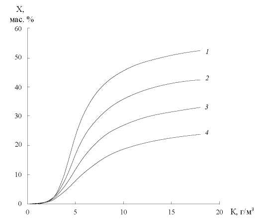 Рис. 4. Зависимость остаточной концентрации метанола в воде от концентрации метанола в потоке орошения (3 ТТ, 30°С) и удельного расхода орошения: 1 – 3 г/м3, 2 – 2 г/м3, 3 – 1 г/м3, 4 – 0,5 г/м3.