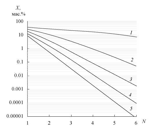 Рис. 5. Зависимость остаточного содержания метанола в воде от числа ТТ и температуры при постоянных значениях удельного расхода орошения 3 г/м3 и концентрации орошения 60 мас. %. Температуры десорбции: 1 – 20°С, 2 – 30°С, 3 – 40°С, 4 – 50оС, 5 – 60°С.