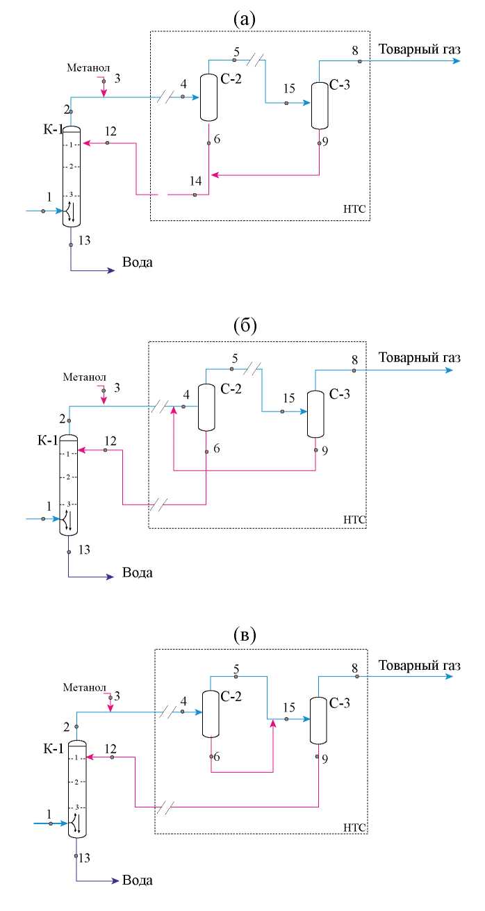 Конфигурация установки низкотемпературной сепарации. Концентрация метанола в потоке орошения и концентрация ВМР могут регулироваться конфигурацией блока НТС. Возможны несколько вариантов формирования потока орошения колонны К-1. В настоящей работе рассматриваются три из них (рис. 6). Вариант с подачей ВМР из сепаратора С-2 считаем нерациональным, так как он предполагает дополнительные и неоправданные потери метанола и здесь не рассматривается.
