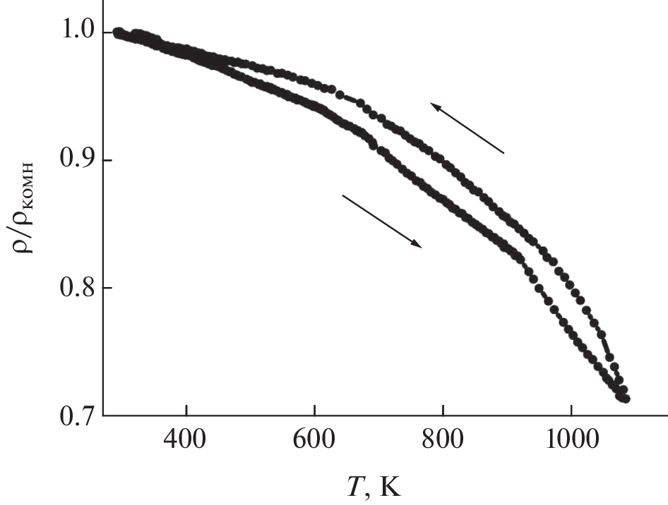 The structure and electrical resistance of the alloy Ni45Mn46In9 were studied. At room temperature, Ni45Mn46In9 is ordered into the cubic structure L21, characteristic of Heusler alloys. Throughout the entire temperature range from 77 to 1100 K, a large specific resistance and negative temperature coefficient of resistance are observed. Conductivity obeys Mott’s law T–1/4 with the addition of a metal contribution. The specific features observed in the temperature dependence of the electrical resistance curve suggest that in this alloy the phase transition between the cubic austenitic phase and martensitic phase with lower symmetry, characteristic of ferromagnetic nonstoichiometric Heusler alloys, occurs at an unusually high temperature.