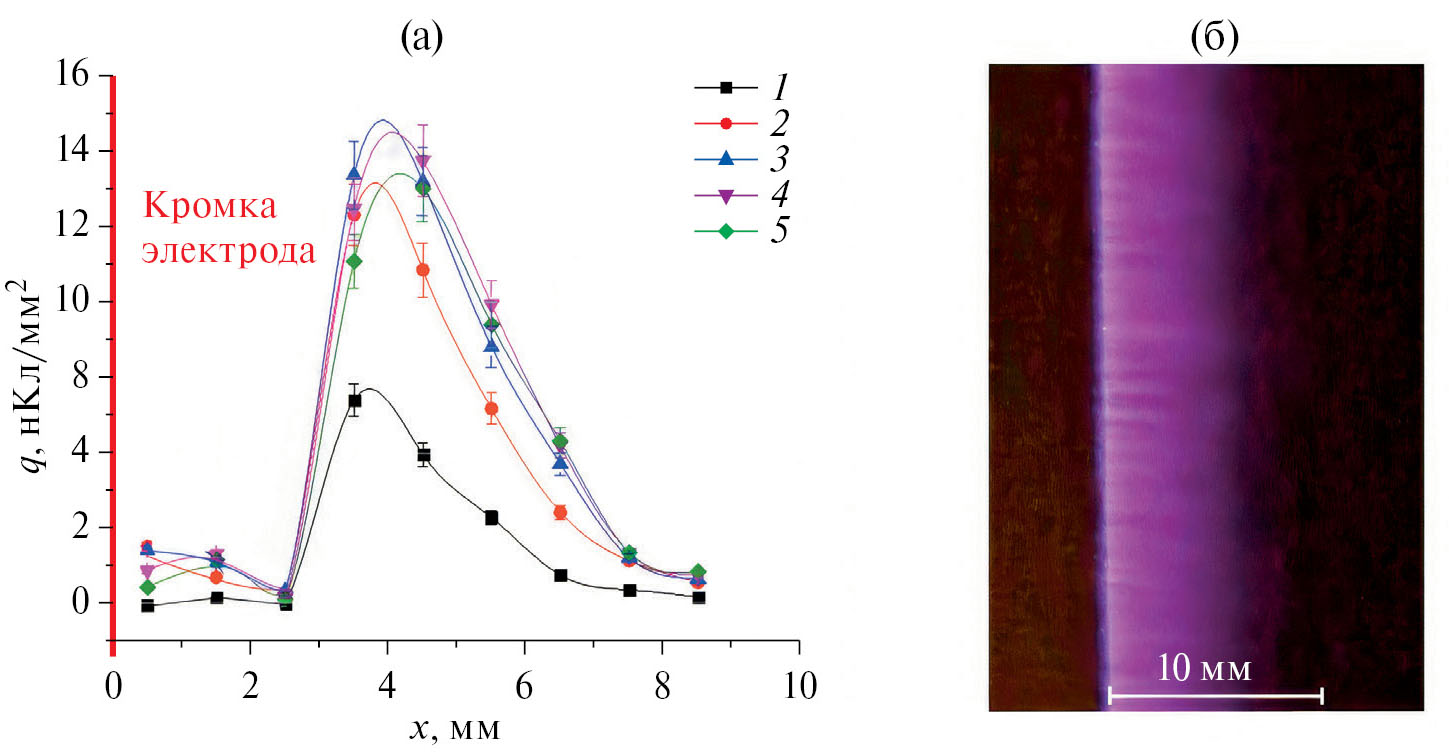 Рис. 7. Распределение заряда, индуцированного на поверхности диэлектрика, в различные моменты времени после инициации разряда (1 – 50 мкс, 2 – 100, 3 – 150, 4 – 250, 5 – 30 мс) при амплитуде приложенного напряжения 5 кВ в неподвижном воздухе (а); (б) – изображение разряда при этих параметрах, полученное с экспозицией 30 мс.