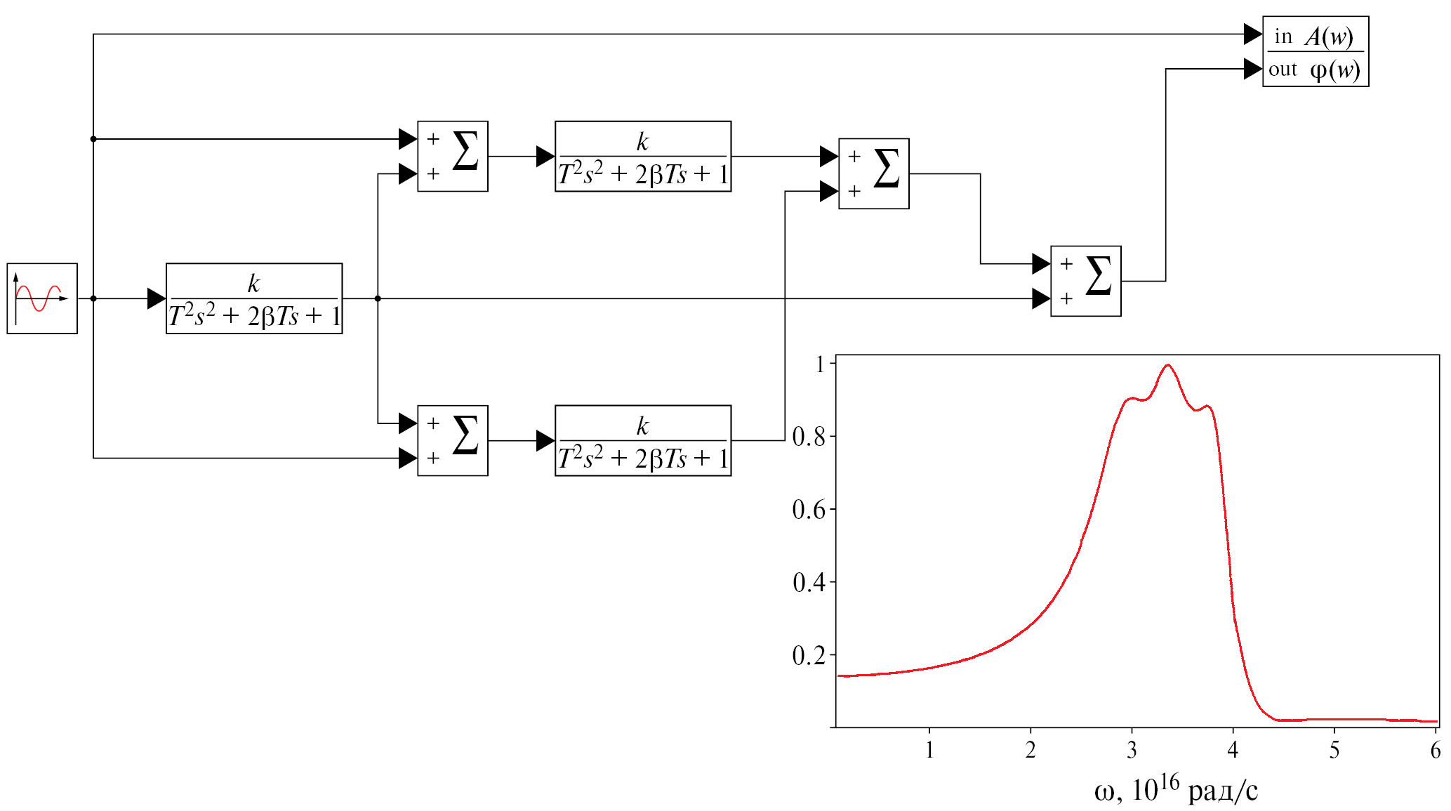 В [33] предложена наглядная модель динамики электрон-фононного взаимодействия в виде апериодического звена второго порядка. Данный подход можно расширить применительно к лазерно-индуцированному широкополосному излучению. Авторами предлагается имитационная модель излучения, суть которой состоит в том, что с каждой отдельной спектральной линией увязывается апериодическое звено второго порядка с коэффициентом передачи k. Это звено описывается дифференциальным уравнением затухающих колебаний вида: