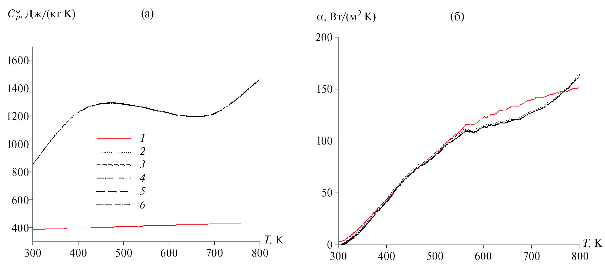 Рис. 3. Температурные зависимости удельной теплоемкости (а) и коэффициента теплоотдачи (б) образцов: 1 – эталона, 2 – AlFe5Si10, 3 – AlFe5Si10 + 0.05% Sn, 4 – 0.1%, 5 – 0.5%, 6 – 1.0%.