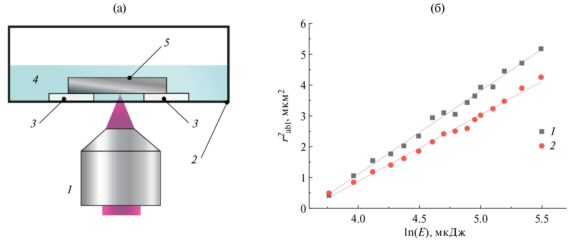 Рис. 3. Измерение размера лазерного пятна: (а) мишенный узел: 1 – микрообъектив, 2 – чашка Петри со стеклянным дном, 3 – проставки, 4 – вода, 5 – мишень; (б) – зависимость квадрата размера кратера от логарифма энергии ln(E): 1, 2 – размеры вдоль большой и малой осей кратера.