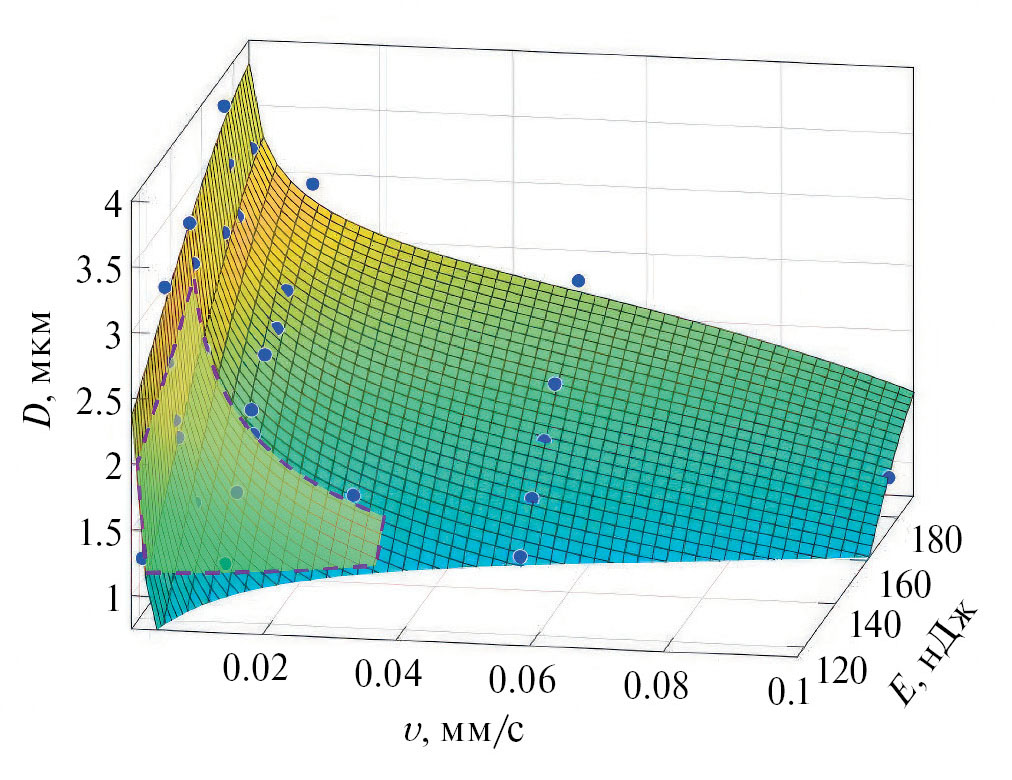 Найденные значения коэффициентов с использованием функции fittype в среде Matlab R2021b составили: a = 1.553, b = 0.5229, c = –3.468 × 10–7, d = 16.79, e = –39.95, h = 357. Ошибка аппроксимации экспериментальных данных заданной поверхностью не превысила 0.2 мкм (определяется точностью стыковки данных в сериях Dav(υ) и Dav(E)), что соответствует погрешности не более 10%. Коэффициент детерминации составил R2 = 0.9868. Границы применимости функционала (3) задаются неравенствами 0.25 ≤ υ ≤ 100 мкм/с и 115 ≤ E ≤ 190 нДж для всех D(E, υ) > 0.7 мкм.