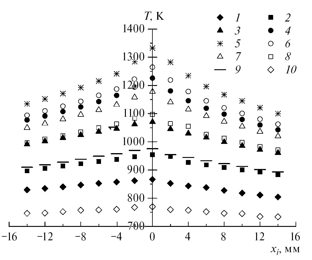 Распределение температуры в зависимости от расстояния xi, которое отсчитывается от контактной плоскости Т(R, xi), измерялось с шагом 150–200 К при последовательном повышении Т от ~750 до ~1700 К и затем понижении температуры. Измерения проводились в стационарном тепловом режиме. Время предварительной выдержки для каждого режима составляло 15 мин при низких температурах и 20 мин при высоких.