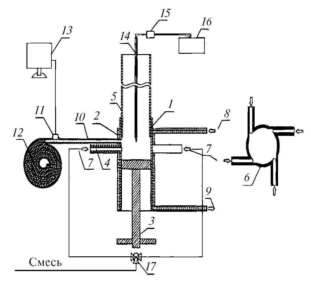 Рис. 1. Схема экспериментальной установки: 1 – входная камера; 2 – охлаждающий контур; 3 – винтовой поршень; 4 – патрубок подачи топливовоздушной смеси; 5 – цилиндрическая труба-резонатор; 6 – схема расположения патрубков; 7 – трубопроводы подвода смеси к патрубкам; 8, 9 – вход и выход охлаждающей воды; 10 – акустический зонд, щуп; 11 – микрофон; 12 – спиралевидная звукопоглощающая трубка; 13 – компьютер; 14 – термопара ВР 5/20; 15 – компенсатор холодного спая; 16 – цифровой прибор Ф266; 17 – распределитель смеси.