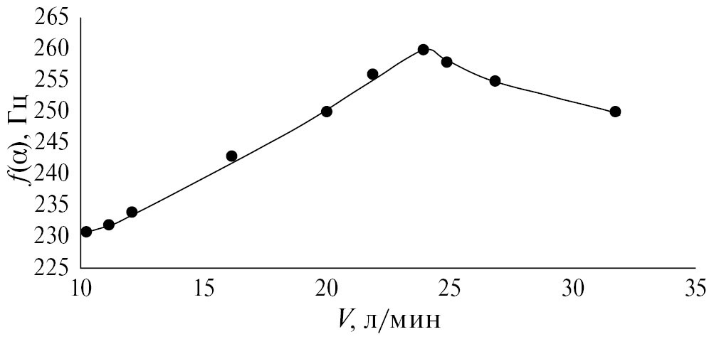Рис. 2. Зависимость частоты колебаний газа от расхода смеси.