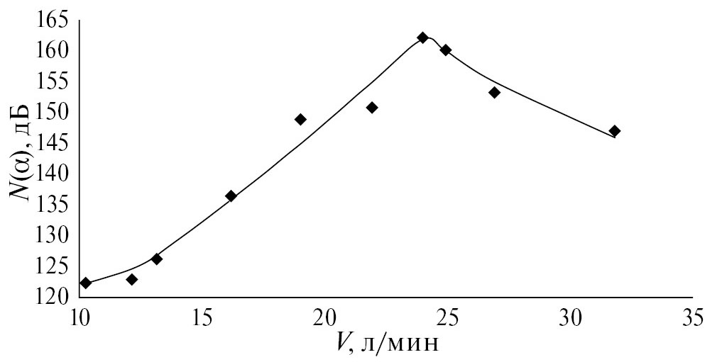 Исследовано влияние расхода смеси на частоту и амплитуду колебаний газа при условии, когда коэффициент избытка воздуха постоянен. Данные получены для трубопроводов, подводящих смесь к патрубкам, длиной lt = 0.48 м. Если α = 1, увеличение расхода смеси от 10.2 до 24 л/мин вызывает повышение частоты колебаний до максимального значения 260 Гц (рис. 2). Дальнейшее изменение расхода смеси до 32 л/мин приводит к снижению частоты. Характер зависимости уровня звукового давления в зоне горения от расхода смеси (рис. 3) такой же, как для частоты колебаний. Имеется максимум 162 дБ, который соответствует максимальной частоте.