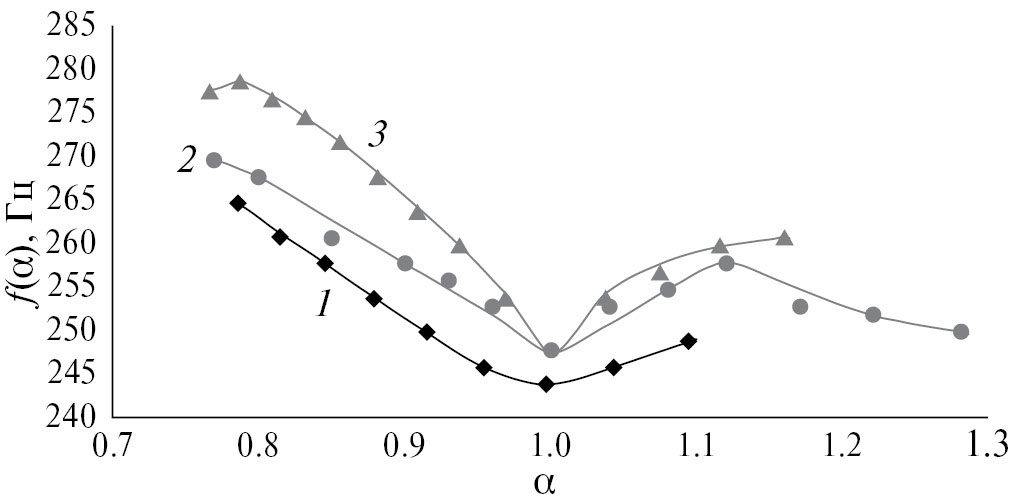 Рис. 4. Зависимости частоты акустических колебаний от коэффициента избытка воздуха для трех фиксированных расходов воздуха: 1 – Vα = 21 л/мин, 2 – 25.8, 3 – 27.