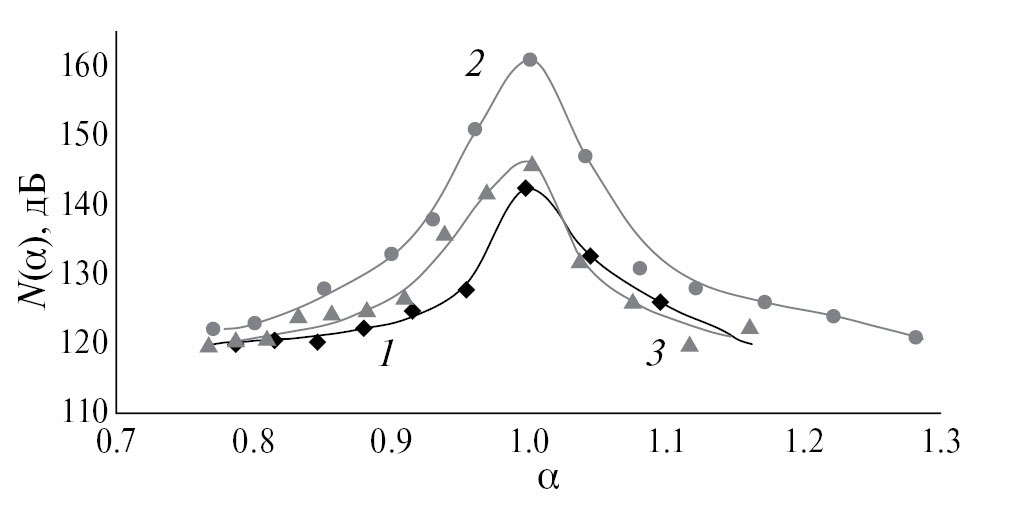 Рис. 5. Зависимости амплитуды акустических колебаний от коэффициента избытка воздуха: 1 – Vα = 21 л/мин, 2 – 25.8, 3 – 27.